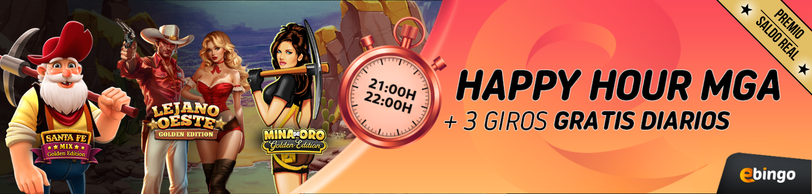 Accede cada día de 21:00h a 22:00h a cualquier slots de 3 rodillos de MGA y, si eres uno de los 100 usuarios más rápidos recibirás 3 GIROS GRATIS en saldo efectivo.